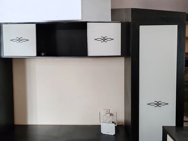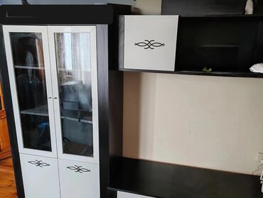Qonaq otağı mebelləri dəsti Tərkibi: - Vitrin şkaf: üst hissəsi şüşə qapılı, 3 şüşə rəfli; alt hissəsi iki bölməli qapalı dolab. Qara-ağ rəngdə, dekorativ xəttlər və metal tutacaqlarla. - Tv stend...