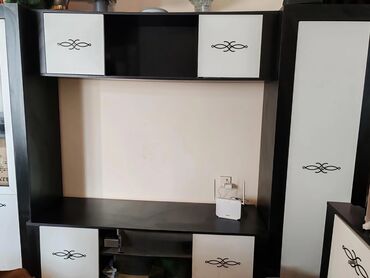 Qonaq otağı üçün mebel dəsti - Rəng: qara-ağ kontrast - Tərkib: - Şkaf-vitrin: iki şüşəli qapı, içəridə rəflər; aşağı hissədə iki ayrıca bölmə/qapı. Dekorativ tutacaqlar. - TV altlığı/komod: g...