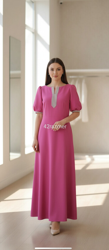 Bənövşəyi/çəhrayı tonlarda zərif qadın donu. Orta uzunluq, yüngül ətək açılımı ilə axıcı kəsim. Qısa, həcimli puff qol dizaynı; qol uclarında parlaq daş işləməli bəzək. Sinənin ön hissəsində V formalı, rhinestone/daşılı dekorativ panel vurğusu. Dairəvi yaxa. Foto üzərində göstərildiyi kimi: 42 razmer. Gündəlikdən xüsusi günlərə qədər müxtəlif məkanlar üçün uyğundur. Minimalist, eyni zamanda zərif görünüş yaradır. Rəng və detallar şəkillərdə aydın görünür.