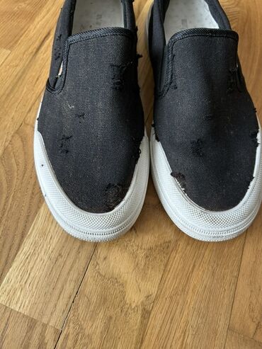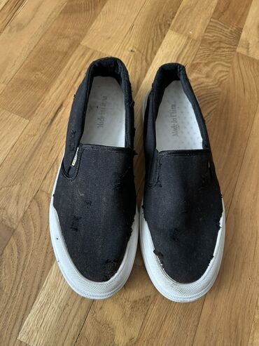 Denim slip-on krosovkalar - Model: açıq dabanlı, slip-on tipli - Material: mavi cins (denim) kumaş, kənarları qəsdən “tökülmüş” fray dizaynlı - Bağlama: klassik ağ şnur - Daban: qalın, ağ rəngli r...