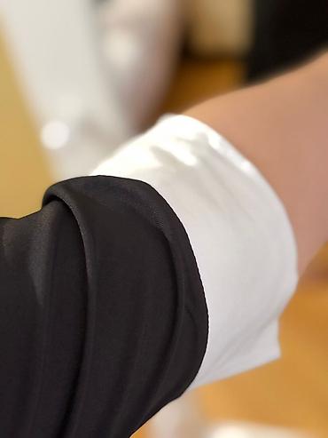 - Rəng: qara korpus, ağ kontrast yaxalıq və manjetlər