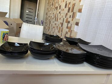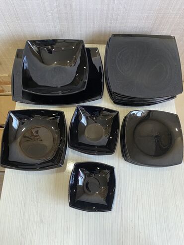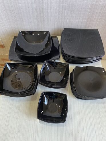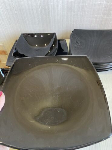 Qara rəngli kvadrat formalı luminark yemək qabları dəsti. Bezilerinde ciziglar var sekillerden bilinir. Ona gore ucuz satilir. Satishda 1 ededi 5-6-7 m dir