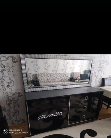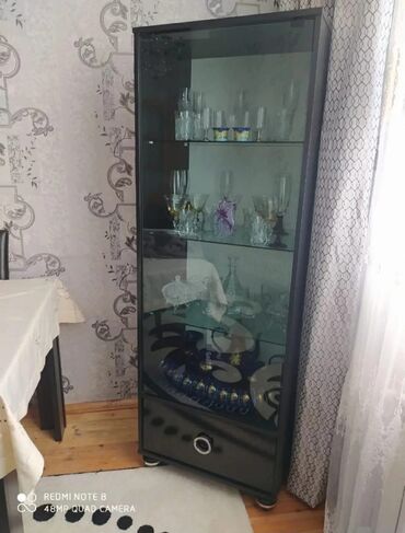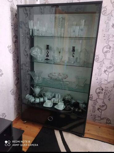 Dəstə güzgülü kamod və iki vitrin şkaf daxildir. Güzgülü kamod geniş saxlama sahəsi təmin edən iki yan qapı və üç mərkəzi siyirtməyə malikdir. Siyirtmələr dairəvi gümüşü tutacaqlarla təchiz olunub. Kamodun üstündəki uzun, düzbucaqlı güzgü geniş görünüş sahəsi təklif edir və dekorativ gümüşü çərçivəyə malikdir. Hər iki vitrin şkafı şüşə qapılarla təchiz olunmuşdur ki, bu da saxlama sahəsinin içindəki əşyaların nümayiş etdirilməsinə imkan verir. Vitrinlər fincanlar, bardaqlar və digər qab-qacaqlar kimi əşyaları yerləşdirmək üçün çoxsaylı rəflərə malikdir. Bütün dəst qara rəngdədir və müasir interyerlər üçün uyğundur.