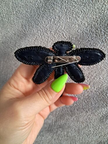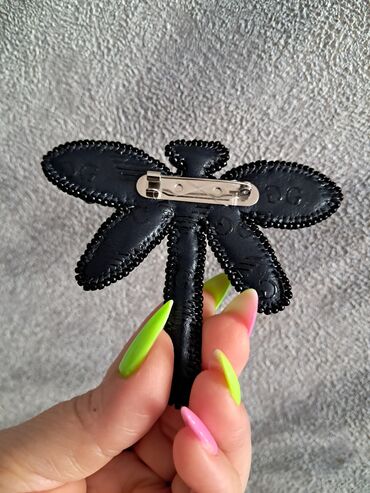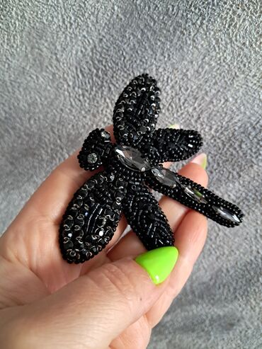 Əl işidi. Təzədi.Qara rəngdə, boncuqlarla bəzədilmiş buqələmun formalı broş. Broşun qanadları və bədəni qara boncuqlarla tamamilə örtülmüşdür. Bədənin mərkəzində və qanadların arasında parıldayan şəffaf daşlar yerləşdirilib ki, bu da ona zərif görünüş verir. Arxa tərəfində geyimə asanlıqla bərkidilməsi üçün metal sancaq mövcuddur. Həm gündəlik geyim, həm də xüsusi tədbirlər üçün istifadə oluna bilər.