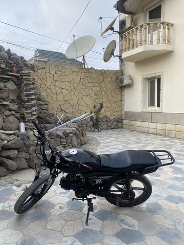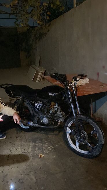 Moped/motosiklet – M50 (80cc) - Mühərrik: 50cc, karbüratorlu, 4 vitesli yarı-avtomat (ayaqla ötürmə). - Gövdə/rəng: Qara gövdə, çən və ön hissə üzərində dekorativ stikerlər. - İşıqlandırma: Ko...