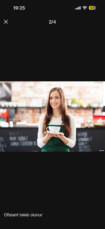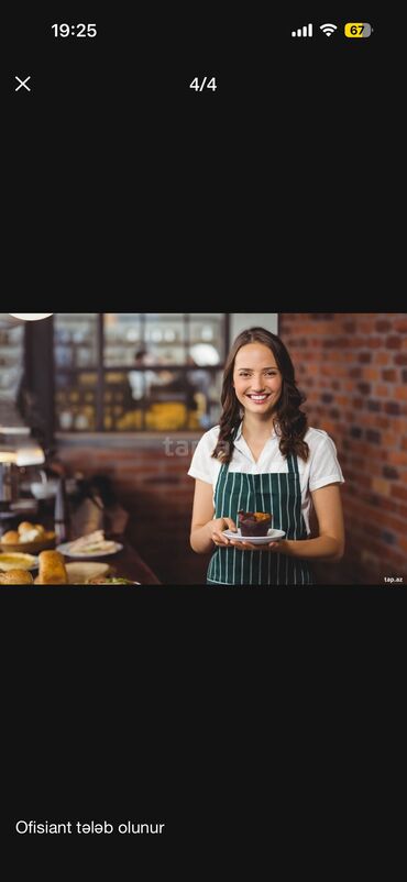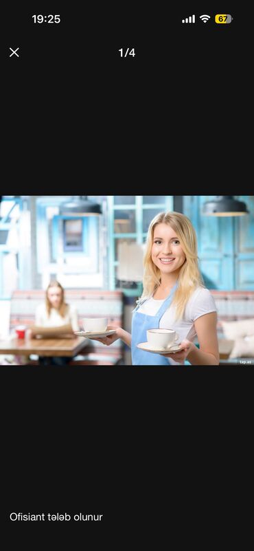 Tecili ofisiant xanim teleb olunur yas 18 - 30 maas 25 azn+cayevoy zehmet olmasa watsapa yazin ünvan:Lütfi zadə 98.Neapol dairesinin yaxinliqinda
