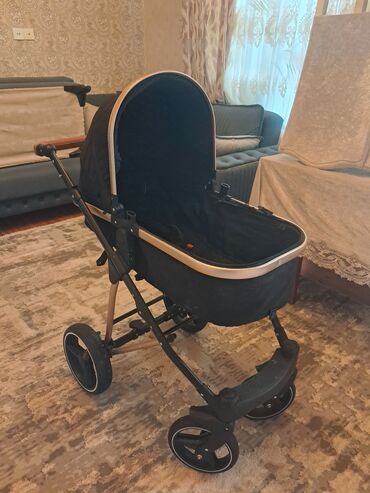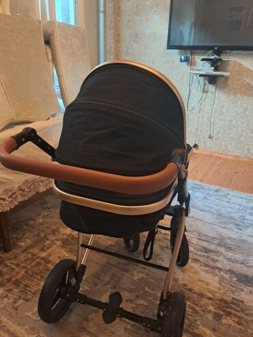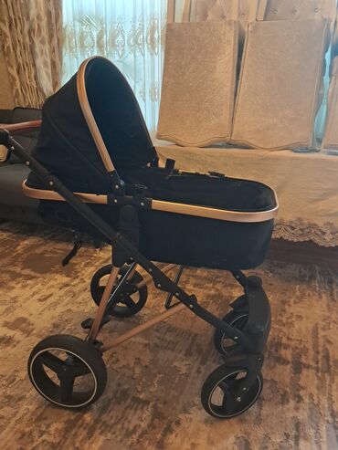 !!!Cox az istifade olunub seliqeli vezyetdedir!!! Uşaq arabası – premium dizaynlı, qızılı çərçivə və qara parça kombinasyonu. - 2‑in‑1 yeşik tipli beşik/oturacaq bölməsi: körpə üçün uzanma reji...