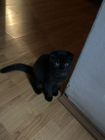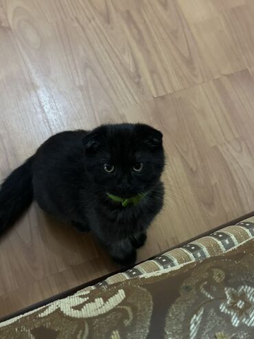 Qara rəngli Scottish Fold tipli pişik - Tam qara, qısa və parlaq tüklü - Dəyirmi baş quruluşu, qatlanmış qulaqlar - Sarımtıl-balıqqulu gözlər - Uzun quyruq, incə bədən quruluşu - Boynunda kiçik ya...