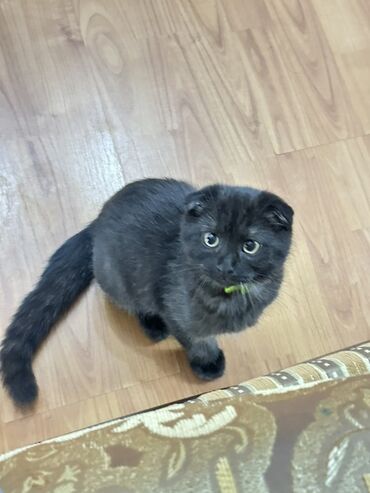 Skottland Fold (qatlanmış qulaqlı) balaca pişiklər - Rənglər: qara və boz - Qısa, yumşaq tüklü, dairəvi sifətli, iri ifadəli gözlər - Qulaqlar qatlanmış formadadır - Ev şəraitində böyüdülür, qum q...