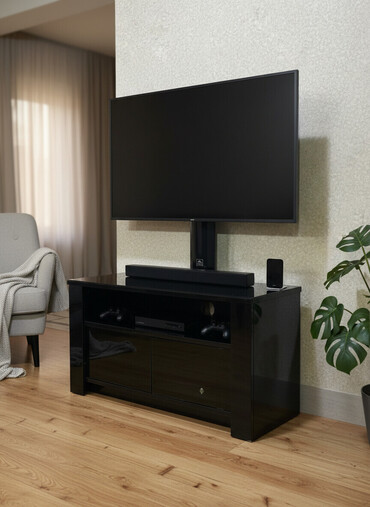 - Üst panel: qalın, parlaq şüşə səth – TV, soundbar və aksesuarlar üçün