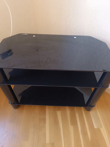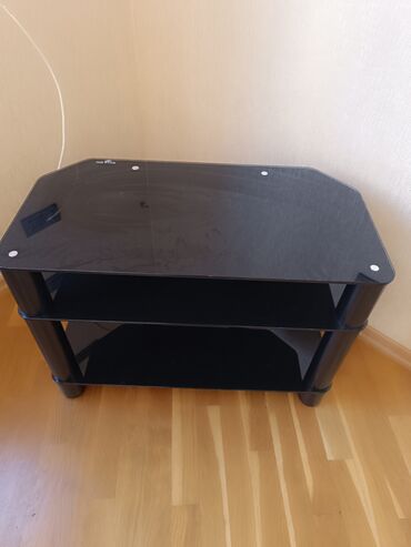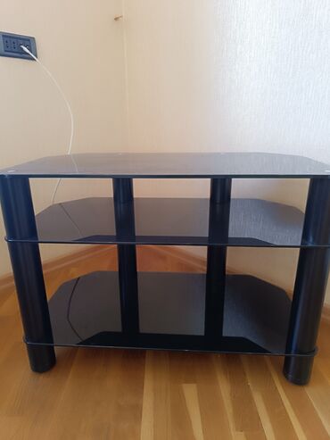 Şüşə TV stolik - Material: qara temperli şüşə səthlər, metal dayaqlar - 3 mərtəbəli konstruksiya: üst hissə TV və dekor üçün, orta rəflər DVD/TV tünər/receiver və digər avadanlıqlar üçün, alt rəf ...