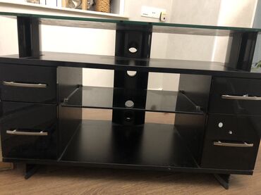 - Orta bölmə: 2 ədəd şüşə raf, arxa hissədə kabel keçidi üçün dairəvi dəliklər – konsol, resiver, media oynadıcı və s. üçün ideal havalandırma və kabel idarəsi.