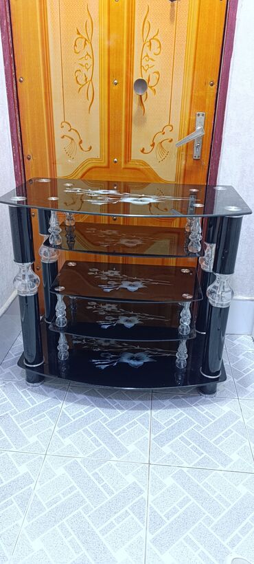 Şüşə TV stolik - Material: qara temperli şüşə səthlər, metal dayaqlar - 3 mərtəbəli konstruksiya: üst hissə TV və dekor üçün, orta rəflər DVD/TV tünər/receiver və digər avadanlıqlar üçün, alt rəf ...
