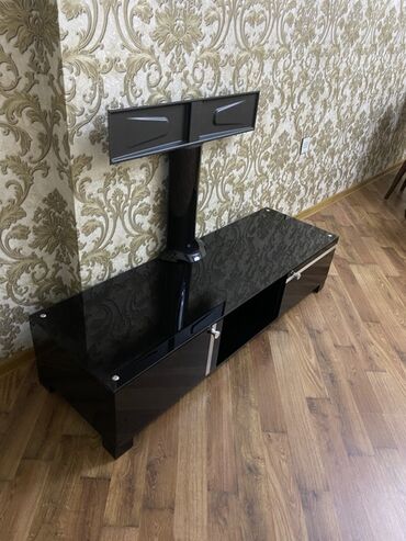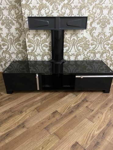 - Material: yüksək parlaq qara temperli şüşə üst səth, laklı korpus, metal montaj sütunu və TV üçün universal asqı paneli