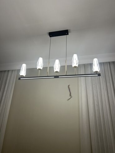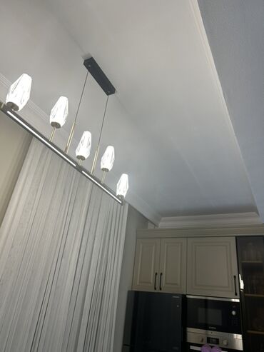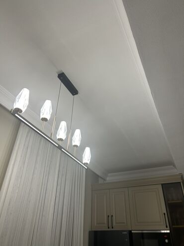 Müasir asma tavandan işıqlandırma – xətvari LED panel və 5 ədəd dekorativ plafonlu çilçıraq.