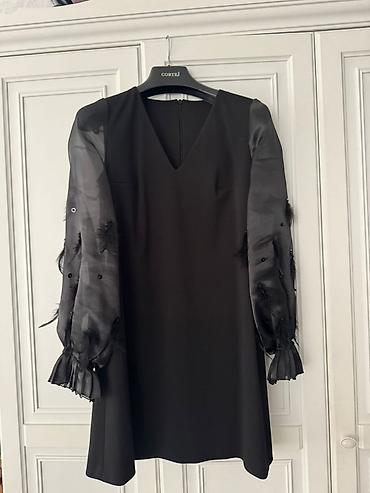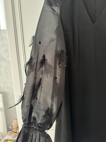 Zərif qara şifon don 1 dəfə geyinilib - Uzun, axıcı siluet; yüngül tül/şifon qatları - Yüksək yaxalı dizayn, arxadan bağlanış - Uzun, şəffaf qol – krujeva detallı və ətəkcikli manjetlər - Ön hiss...
