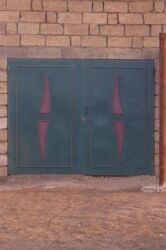 Metaldan iki qanadlı qapı dəsti - Material: qalın metal sac - Rəng: qırmızı/terrakota tonunda boya - Konstruksiya: iki qanadlı, ortadan açılan; daxili pəncərə/qapı keçidi olan model (garaj və ya a...