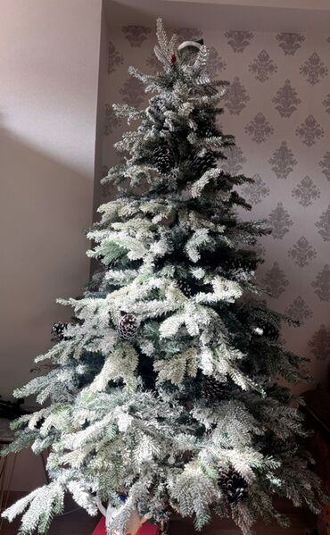 Süni Yeni il şam ağacı - Material: PVC iynəciklər, qar effektli uclar - Rəng: tünd yaşıl, ağ “qar” vurğuları - Hündürlük: təxmini 1.8–2.0 m (şəkilə əsasən tam ölçülü otaq ağacı) - Konstruksiya: me...