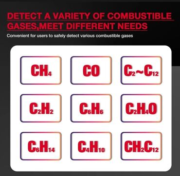 ● Test qazı (hissələrin siyahısı): aseton, asetilen, spirt, ammonyak, benzol, butan, etanol, oksiran, benzin, heksan, hidrogen, metan, NAFTA, təbii qaz, boya tiner, propan, həlledicilər və s.