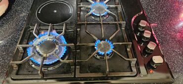 Qaz plitəsi və soba kombi - 4 gözlü qaz ocağı: üst hissədə metal barmaqlıqlar, mexaniki idarəetmə düymələri - Aşağıda qaz sobası: şüşə pəncərəli ön qapı, sobanın temperatur və alov tənzimləmə düym...