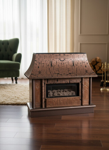 - Ön panel: şüşə pəncərə, içəridə dekorativ odun/kömrəklər