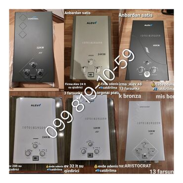 Mətbəx və hamamda fasiləsiz isti su üçün müxtəlif güc və dizaynlarda modellər mövcuddur. Şəkillərdə hər modelin ön panelində funksional idarəetmə düymələri və displeyli versiyalar göstərilib.