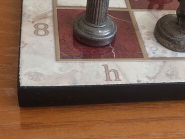- Fiqurlar: metal materialdan, qədim döyüşçü və sütun motivləri ilə detallı işlənmiş kompozisiyalar. Piyada fiqurları qalxanlı əsgər, atlar süvari, qalalar sütun formasındadır; fil, vəzir və şah heykəlvari fiqurlarla təmsil olunub.