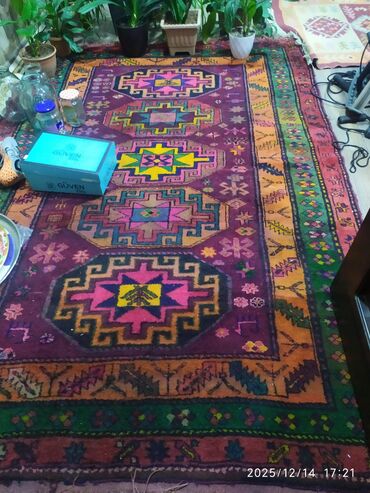 Əl toxuması xalça - Naxış: mərkəzdə ardıcıl çoxbucaqlı medalyonlar, künclərdə və haşiyələrdə klassik ornamental motivlər - Rəng palitrası: tünd bənövşəyi/çam-xamralı tonlar, narıncı, qırmızı, yaşı...