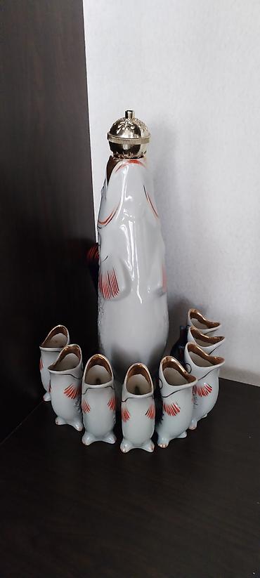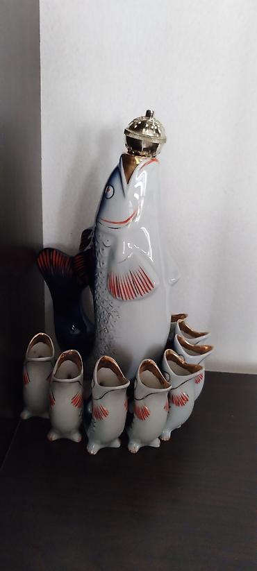 Porcelain balıq formasında sovet dövrü içki dəsti - Material: yüksək keyfiyyətli farfor/porcelain - Dizayn: böyük balıq formasında qrafin (üstü qızılı rəngli qapaqla), yanlarında kiçik balıq forma...