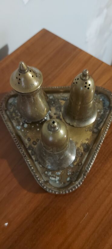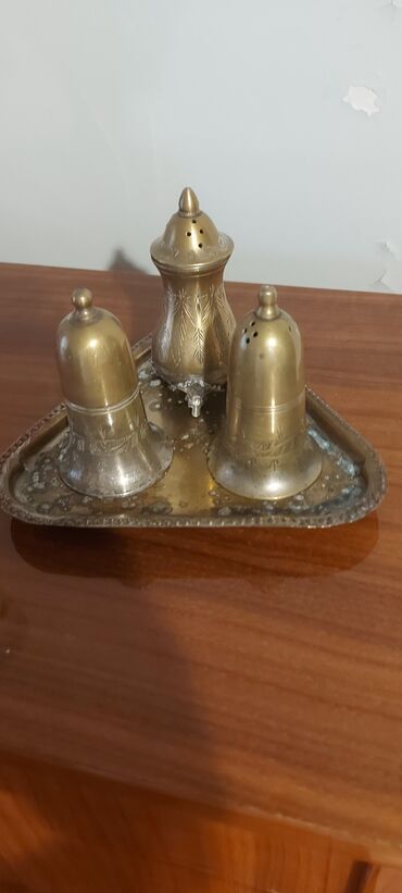 Üç ədəd qədimi üslubda hazırlanmış ədviyyat qabı dəsti. Dəstə duz və istiot səpmək üçün iki ədəd qab, həmçinin daha xırda ədviyyatları səpmək üçün nəzərdə tutulmuş bir ədəd qab daxildir. Qablar və altlıq üzərində oyma naxışlar vardır. Dəst mətbəxinizə retro üslubda gözəllik qatacaq.Latundu material