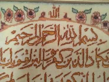 Ödənişli çatdırılmaÜnvandan götürməQədimi, ipək sapla toxunmuş Quran ayəsi, əl işi, taxta çərçivədə divar xalçası. İsfahandan alınıb.