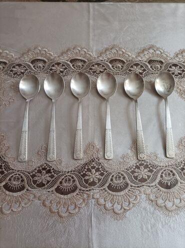 Qədimi metal məişət qaşıqları dəsti - Növ: çay/şirniyyat qaşıqları - Say: 6 ədəd - Material: metal (köhnə dövr istehsalı, üzərində klassik ornamentli naxışlar) - Ölçü: standart çay qaşığı ölçüsü -...