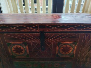 1968 ci ilde düzəldilib - Material: bərk taxta, üstü əl boyası dekorlarla işlənmiş - Dizayn: çoxrəngli (qırmızı, mavi, sarı və yaşıl tonlarda) xalq üslublu geomentrik və floral naxışlar; ön hissə...