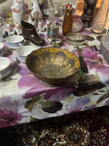 - Şərq motivli oyma naxışlı mis-kalay qab (kasa) – içi və kənarları qızılı-ton dekorlu.