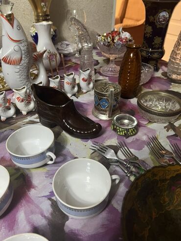 - Qədim üslubda qab-qacaq və biblolar dəsti: balıq formalı porselen “qumqum” və kiçik stəkan/badya fiqurları, şokolad/qənd üçün kreyştal qablar, naxışlı şüşə buynuz dekor, müxtəlif ölçülü kəhrəba rəngli şüşə vazalar.
