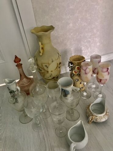 Qarışıq ev əşyaları və dekor dəsti Şəkillərdə görünən müxtəlif mətbəx, servis və dekor əşyaları birlikdə təqdim olunur: - Şüşə dekor vaza və qablar: müxtəlif ölçülü kəpəkli/kəsikli kristal kasala...