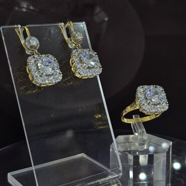 Zərgərlik dəsti – sırğalar və üzük - Dizayn: Yastı kvadrat formalı (kushon silueti) elementlərdən ibarət, ikiqat asmalı sırğalar və uyğun üzüklə tam dəst. - Parıltı: Hər detal sıx bərkidilmiş parl...