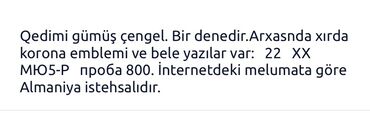 Qedimi gümüş çengel.Bir denedir.Arxasnda xırda korona emblemi ve bele yazılar var: 22 ХХ МЮ5-Р проба 800. İnternetdeki melumata göre Almaniya istehsalıdır.