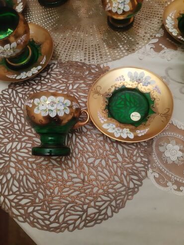 Çay dəsti, rəng - Yaşıl, Bohemia, 6 nəfərlik
