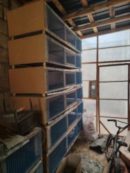 Açıq havada istifadə üçün taxta toyuq damları və voliər komplektləri - Material: təbii ağac konstruksiya, galvanizli tor şəbəkə; dam örtüyü suya davamlı. - Üst hissədə qapalı yuvalama/istirahət bö...