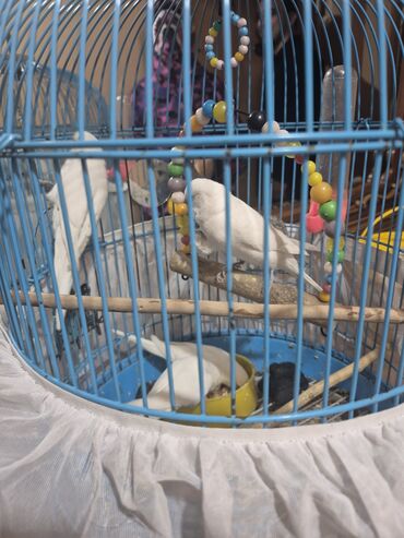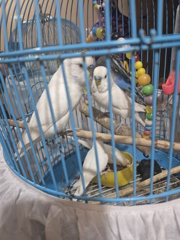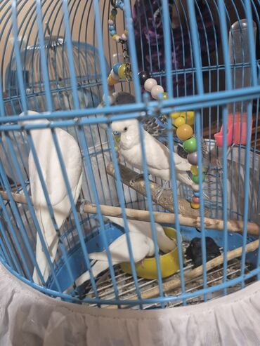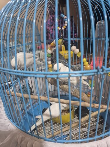 Qəfəsdə bəzəkli dalğıç tutuquşuları (bəzi ağ, biri mavi-boz naxışlı) komplekti.