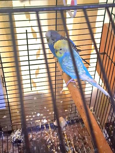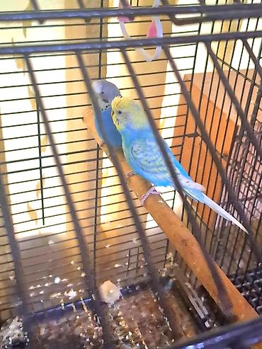 - Növ: Dalmatin naxışlı dalğalı tutuquşular (budgerigar) - Say: 2 ədəd cüt - Rənglər: mavi-göy tonları, qara-ağ zolaqlı naxışlar; biri açıq sarı alınlı - Qəfəs: ağ barmaqlı, altı sarı altlıqla; yem...