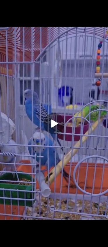 Buda cinsli dalmatian (dalğalı) tutuquşular və aksesuarları - Rənglər: mavi-ağ, açıq krem, yaşıl-sarı və mavi-boz zəngin rəng çalarları - Say: şəkildə eyni qəfəs üzərində bir neçə quş görünür - Qə...