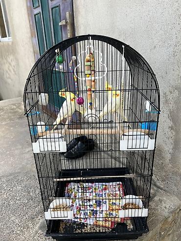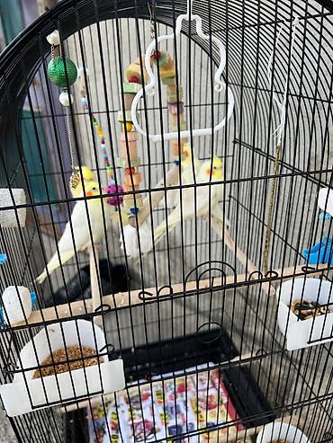 Qəfəs içərisində iki ədəd ağ və sarı rəngli nimfa tutuquşusu var. Qəfəs qara rəngdədir və içərisində taxta tüngləri, oyuncaqlar və yem qabları mövcuddur. Tutuquşular sağlam görünür və aktivdirlər. Evdə saxlamaq üçün əla seçimdir.