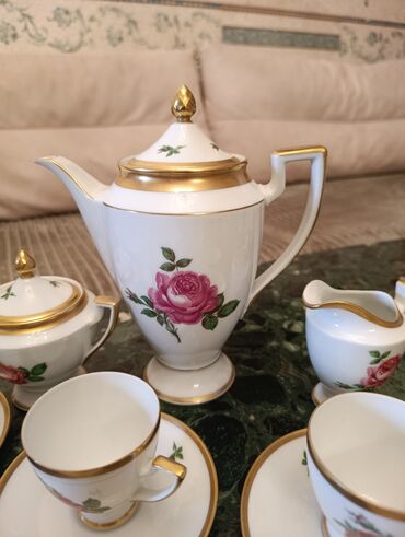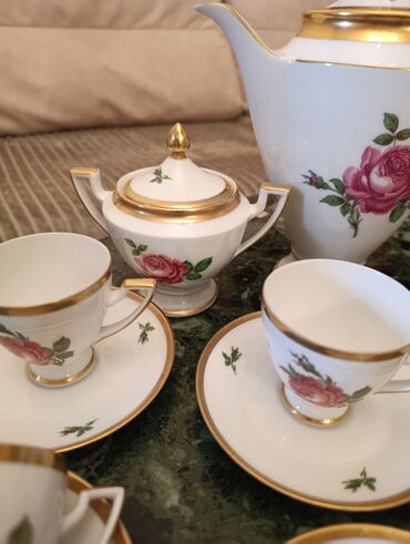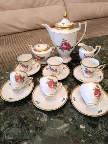 Kahla (Made in GDR) porselen çay-qəhvə dəsti Klassik ağ porselen üzərində qızılı-qəhvəyi ornament və üzüm-buket motivləri. Qızılı haşiyələr, qapaqlarda dekorativ qızıl knopkalar. Dəstin tərkibi (...