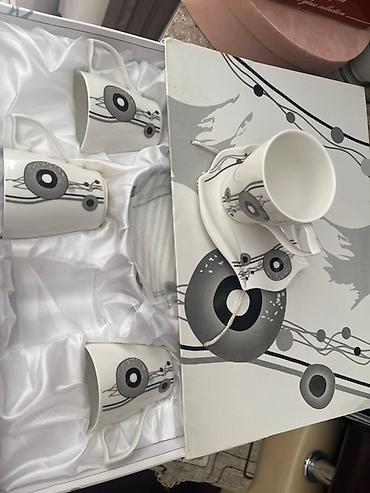 Təzə kofe dəsti. servant malı. çoxdan alınıb. - Rəng: ağ, incə qızılı haşiyə və qızılı qulplar - Zərif klassik dizayn, nazik porselen Komplektin tərkibi: - 1 ədəd uzun formalı qapaqlı çay/qəhvə ...