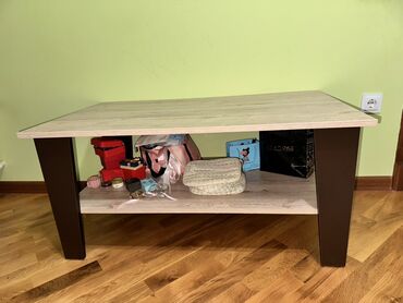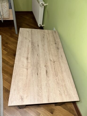 Mebel: Taxta fakturalı kofe/çay masası - Material: Laminat/taxta görünüşlü LDF (ağac teksturası ilə). - Rəng: Açıq qoz (təbii ağac naxışlı). - Dizayn: Düz, minimalist üstlük; dörd ədəd enli, sabit...