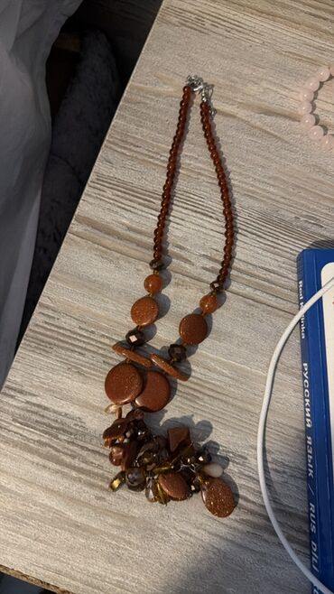 - Material: müxtəlif ölçülü qəhvəyi/qızılı çalarda boncuklar, yastı dairəvi və disk formalı elementlər, fasetli şüşə/quartz tipli daşçalar; metal rəngli qulplu qapanma.