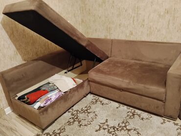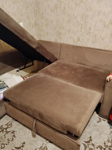 Qonaq otağı, studiya və ya qonaq yatağı kimi istifadə üçün praktik künc divan. Şəkillərdə mexanizmin açıq və yataq variantı göstərilib.