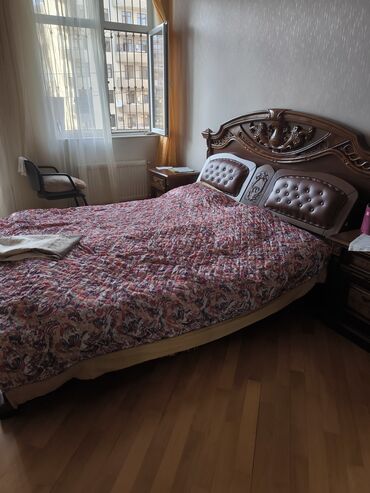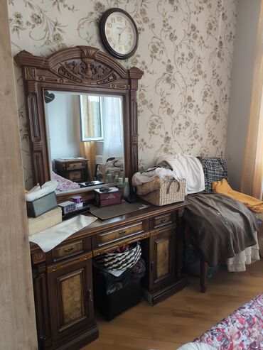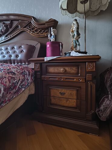 Yataq otağı üçün nəzərdə tutulmuş bu dəstə qəhvəyi rəngli, oyma naxışlı dolab, güzgülü tualet masası, iki tərəf divanı və yataq daxildir. Dolab sürüşmə qapılara, mərkəzi güzgü hissəyə və iki siyirtməyə malikdir. Tualet masası böyük güzgü, çoxsaylı siyirtmələr və oyma detallarla bəzədilmişdir. Dəst klassik üslubda dizayn edilib və yataq otağına zərif görünüş bəxş edir. Hər bir element funksionallıq və estetikanı özündə birləşdirir.